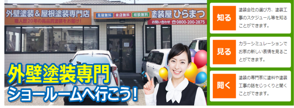 外壁塗装専門ショールームへの来店予約⇒https://www.tosou-hiramatsu.jp/showroom/