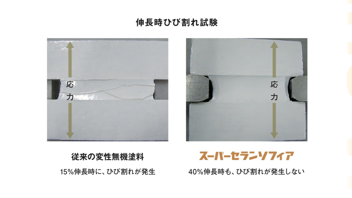 スーパーセランソフィアは柔軟性に優れており、シーリング上に施工した場合のひび割れのリスクを軽減します。