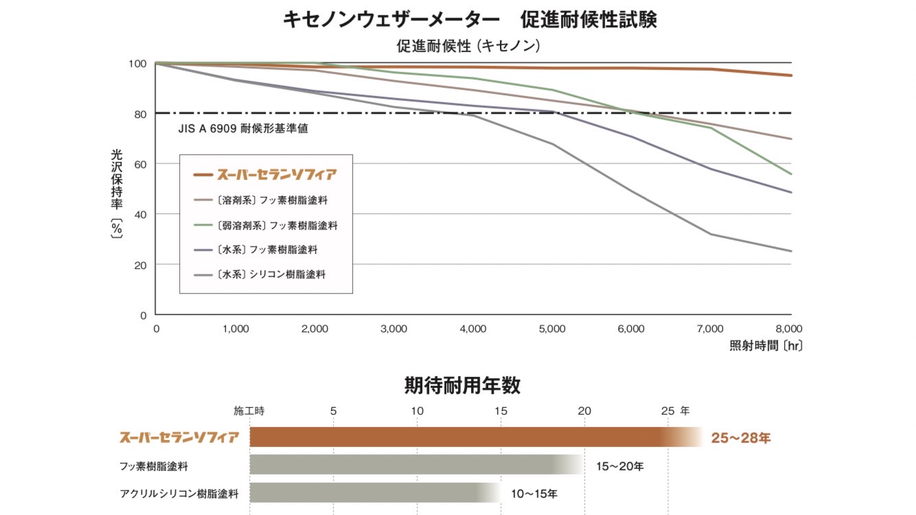 フッ素塗料、シリコン塗料との比較もされながらの数値になるので、圧倒的な耐久力があることがわかります!