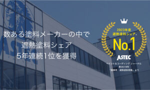 アステックは、高機能塗料の開発において革新的な取り組みを行っています。その代表例が「遮熱塗料」です。夏の強い日差しを反射し、建物の内部温度の上昇を抑えることを望めます。