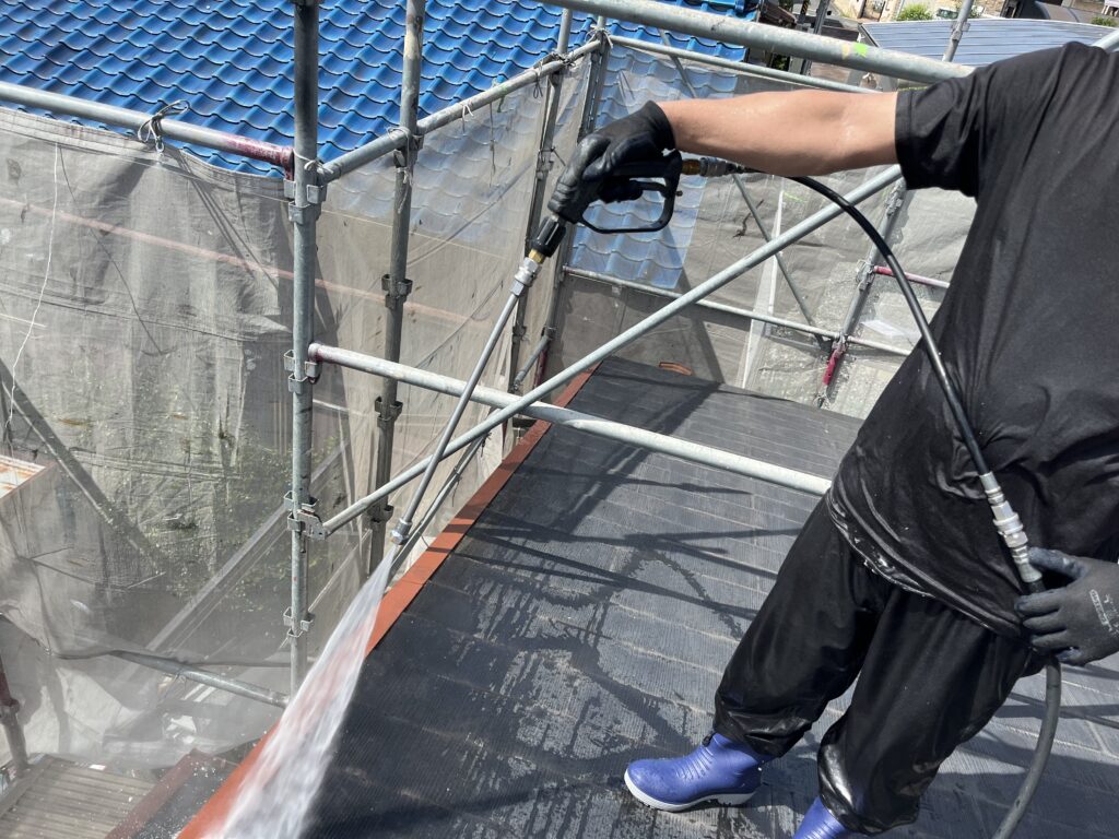足場を組み立てた後、外壁と同じように屋根もホコリや汚れ、コケを高圧の水で洗い流していきます。