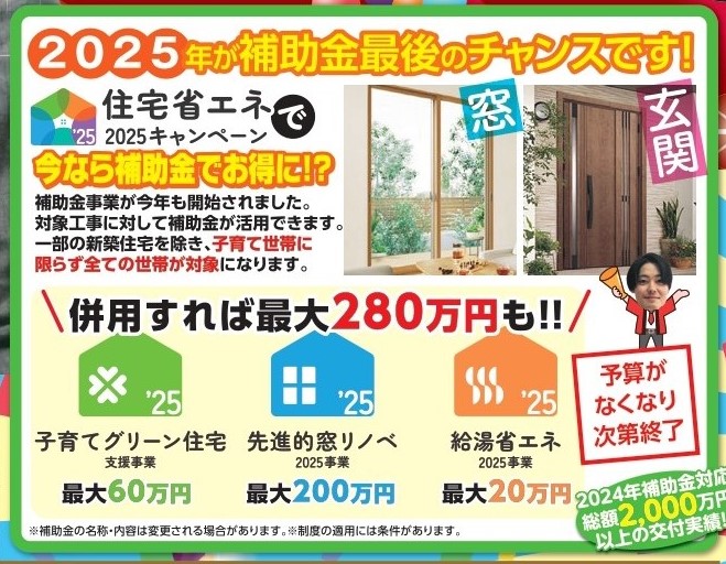 2025年も住宅省エネキャンペーン開始!!併用すれば最大280万円も!!