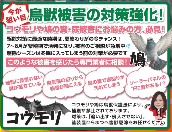 ※こうもり被害は、フンや尿による悪臭・汚れ、ダニや病原菌などの衛生被害、