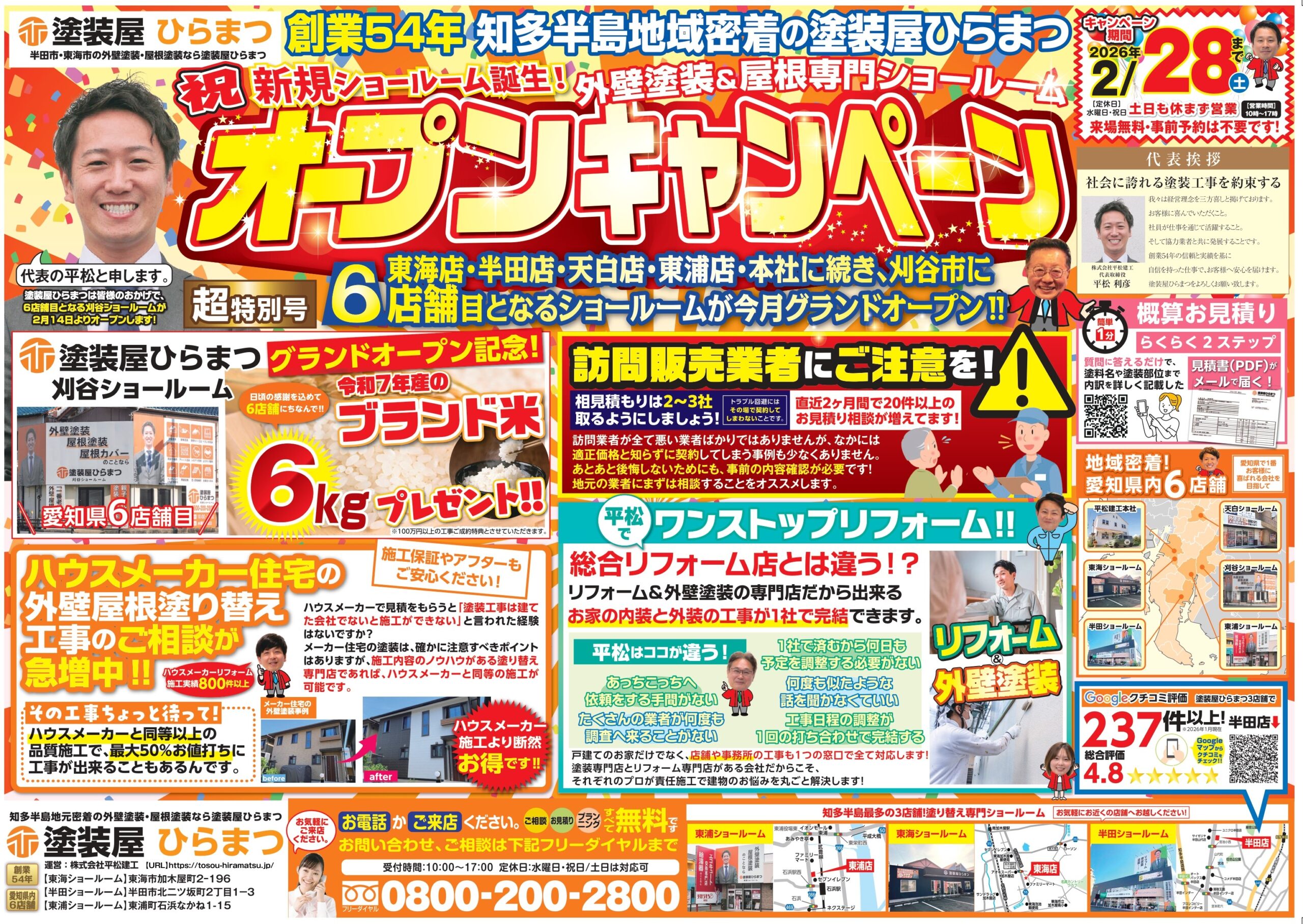 【東海店】【半田店】【東浦店】:祝新規ショールーム誕生!オープンキャンペーン|外壁塗装・屋根塗装は塗装屋ひらまつ