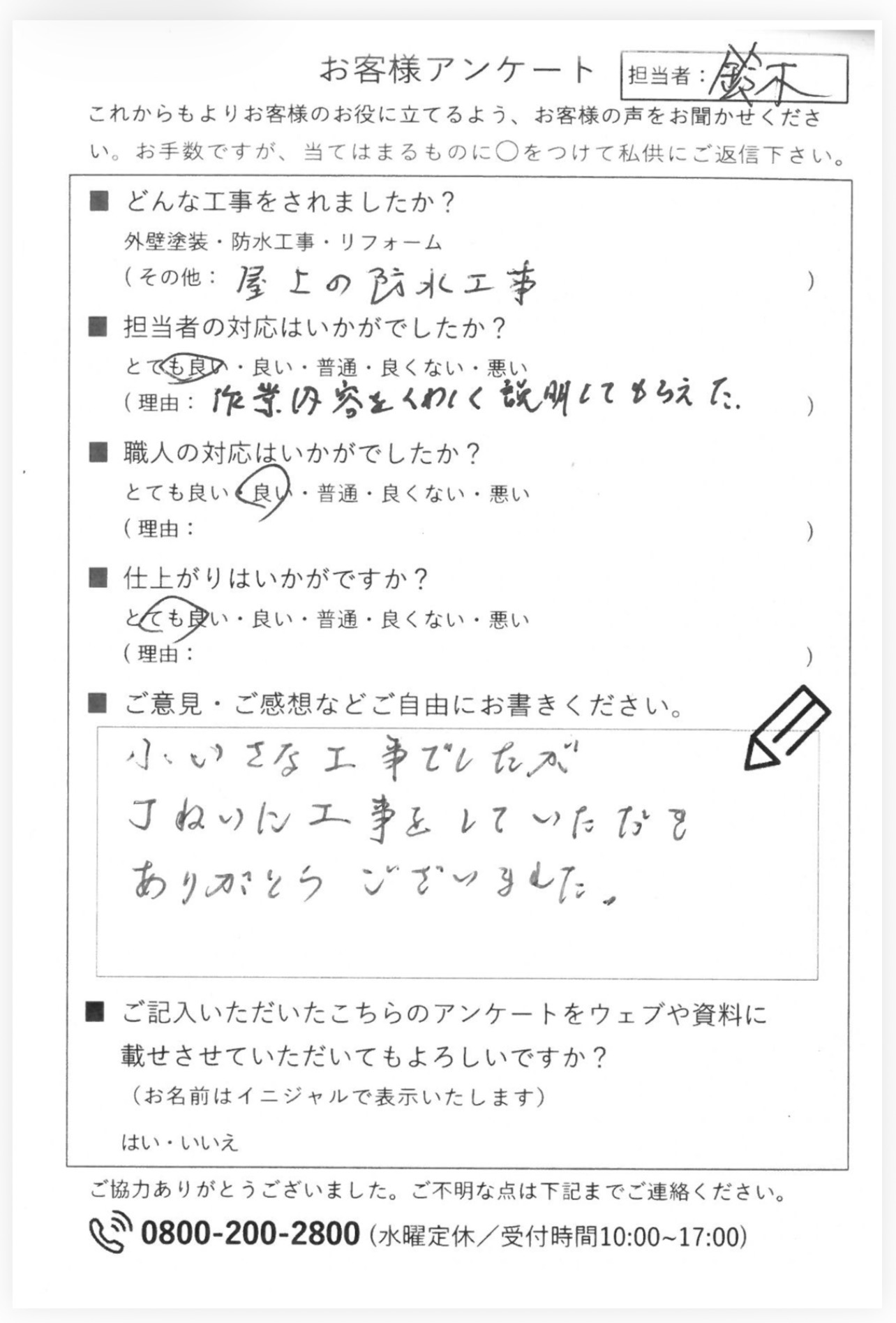 名古屋市H様邸 【名古屋市】屋上の防水工事を行いました。 施工データ 施工場所 名古屋市緑区 施工箇所 屋上の防水工事 どんな工事をされましたか? 外壁塗装 防水工事 リフォーム 屋上の防水工事 担当者の対応はいかがでしたか? とても良い 良い 普通 良くない 悪い 作業内容を詳しく説明してもらえた 職人の対応はいかがでしたか? とても良い 良い 普通 良くない 悪い 仕上がりはいかがですか? とても良い 良い 普通 良くない 悪い ご意見・ご感想などご自由にお書きください。 小さな工事でしたが、丁寧に工事をして頂きありがとうございました。 STAFF 担当したスタッフ 鈴木 敏生 プロフィール 担当事例 前の記事 一覧へ戻る