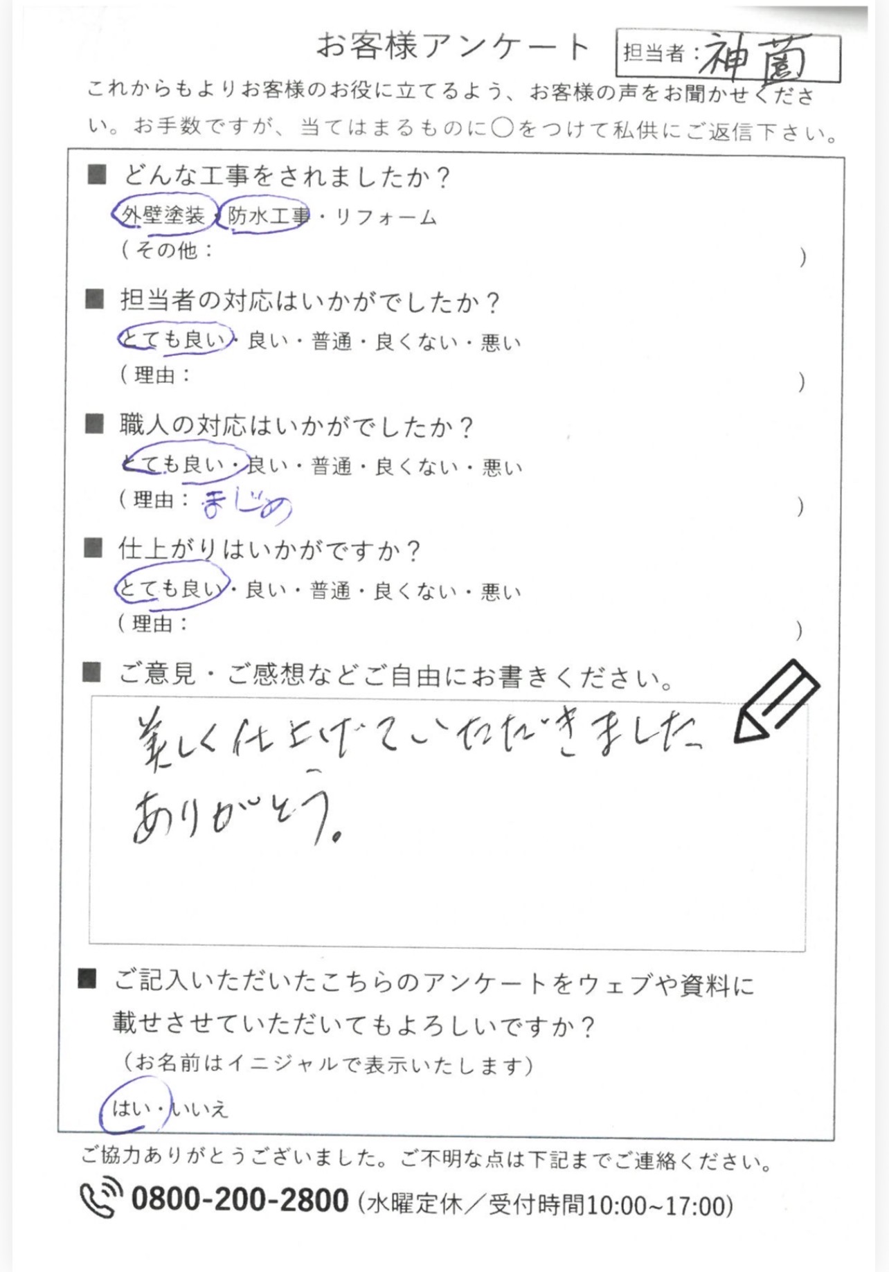 名古屋市緑区O様邸 【名古屋市】外壁塗装・防止工事を行いました。 施工データ 施工場所 名古屋市緑区 施工箇所 外壁塗装 防水工事 どんな工事をされましたか? 外壁塗装 防水工事 リフォーム 担当者の対応はいかがでしたか? とても良い 良い 普通 良くない 悪い 職人の対応はいかがでしたか? とても良い 良い 普通 良くない 悪い まじめ 仕上がりはいかがですか? とても良い 良い 普通 良くない 悪い ご意見・ご感想などご自由にお書きください。 美しく仕上げて頂きました。 ありがとう。 STAFF 担当したスタッフ 神薗 光季 プロフィール 担当事例 前の記事 次の記事 一覧へ戻る