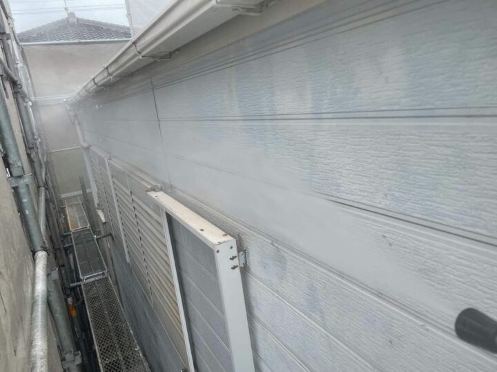 塗装前の下処理として、今まで溜まった外壁の汚れを落としていきます。高圧洗浄は汚れや劣化した塗膜を落とす目的で行います。塗料の密着性は洗浄をしっかり行うことで高まります。