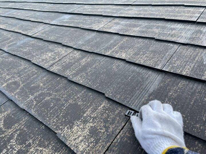 縁切り作業は、屋根材の重なっている部分を塗膜でふさいでしまうのを防ぐ作業です。専用の部材(タスペーサー)を挟み隙間を開けます。