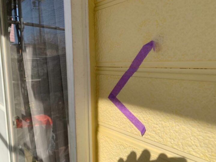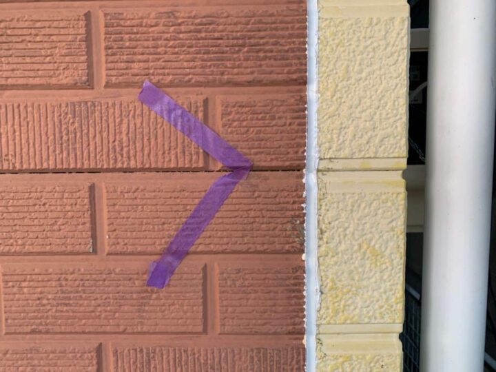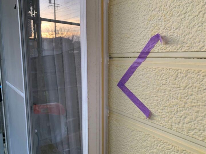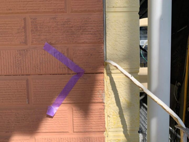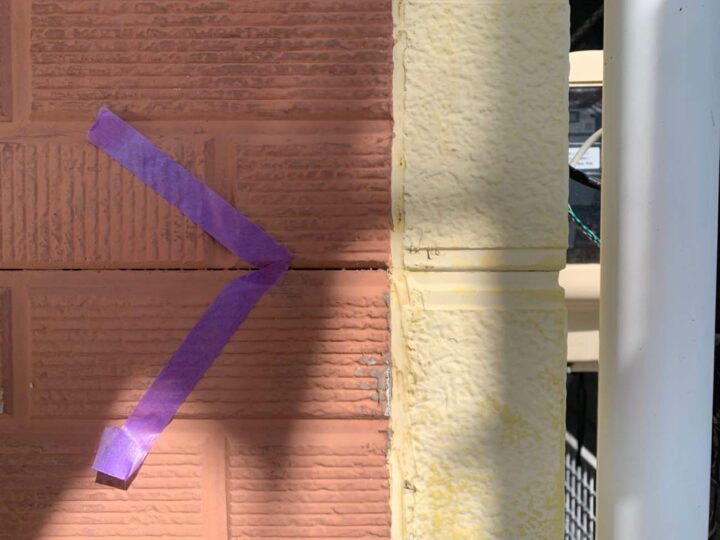 前回塗装されている建物の為、シーリングの上に、前回の塗装の塗膜がのっています。