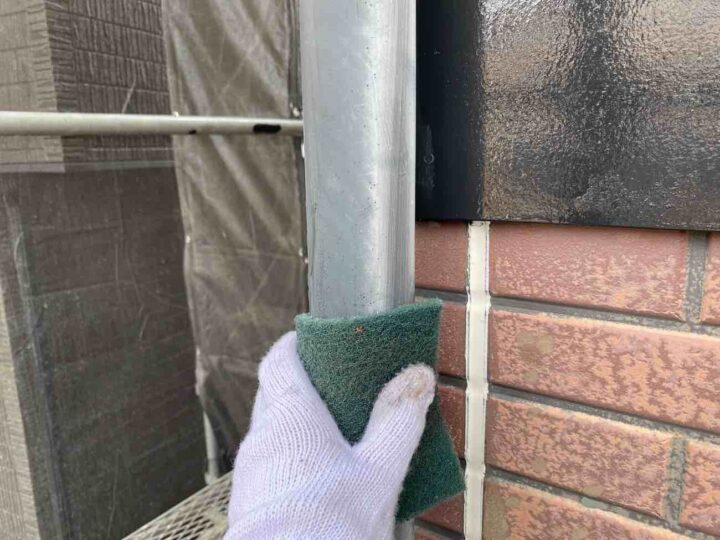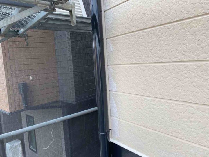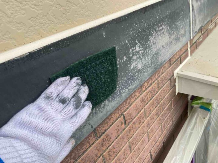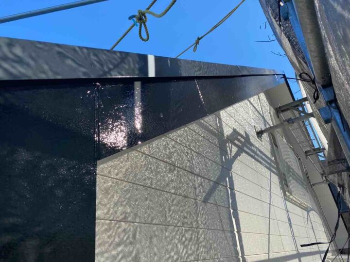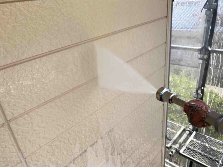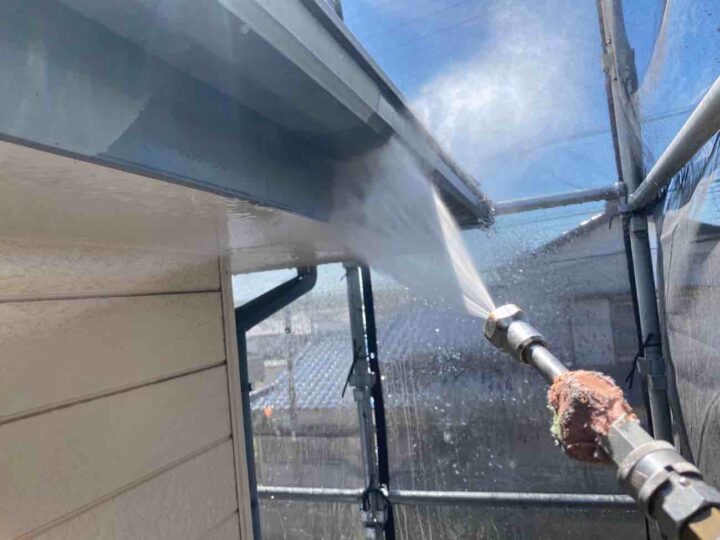 塗装前の下処理として、今まで溜まった外壁の汚れを落としていきます。高圧洗浄は汚れや劣化した塗膜を落とす目的で行います。塗料の密着性は洗浄をしっかり行うことで高まります。