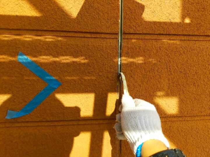 外壁と外壁の間にあるゴムのようなパテの部分の補修作業です。