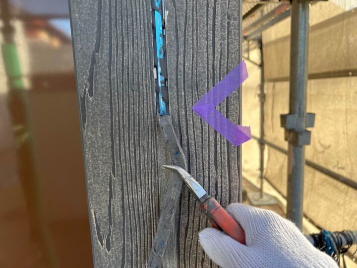 外壁と外壁の間にあるゴムのようなパテの部分の補修作業です。