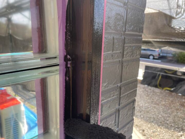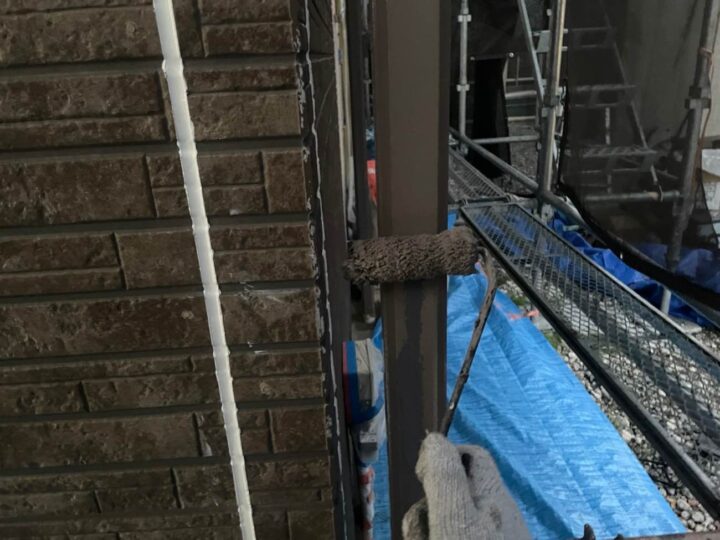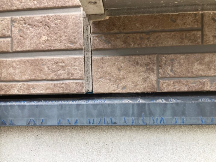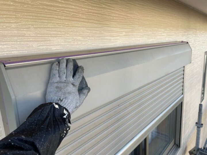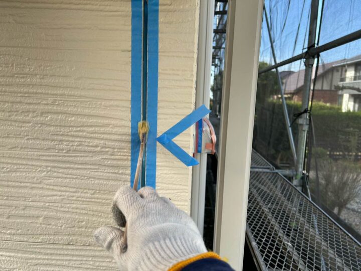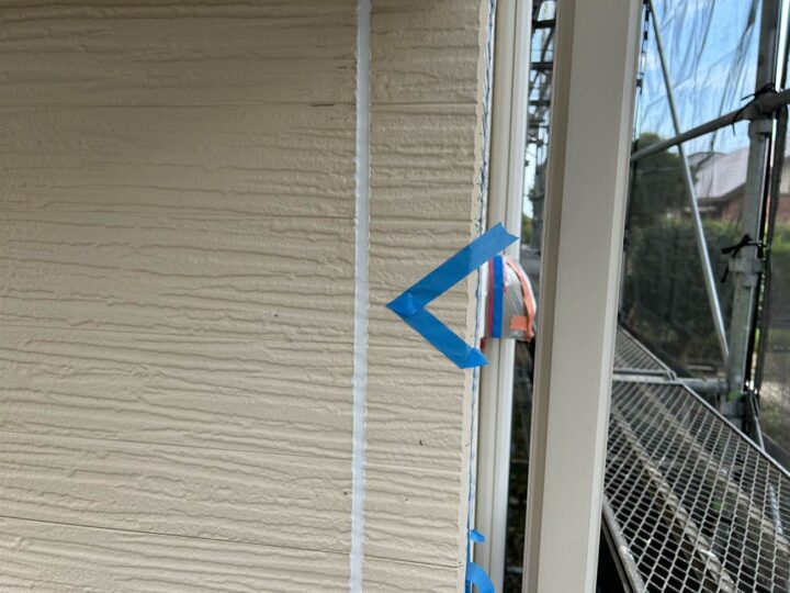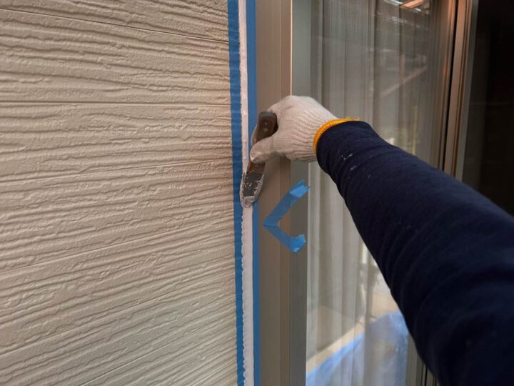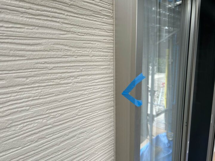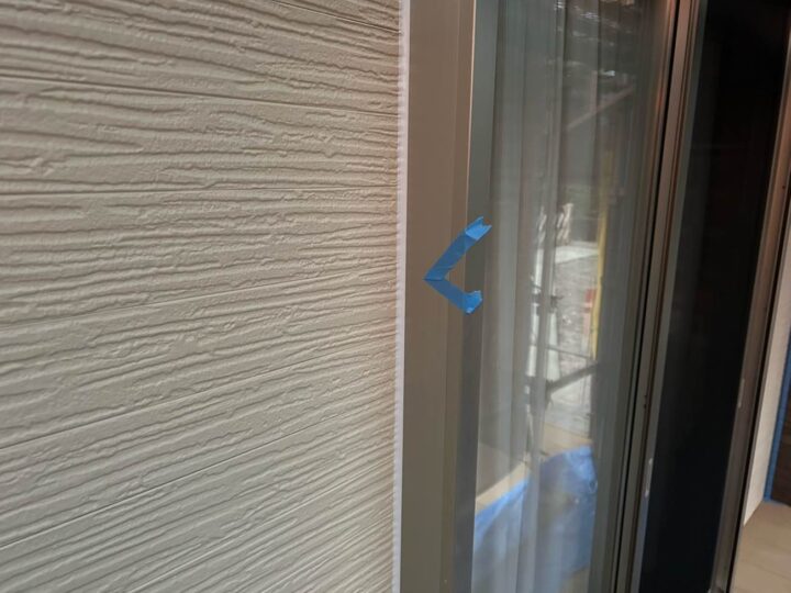 この時外壁にはみ出してしまわぬよう、両サイドに紙テープで養生しています。