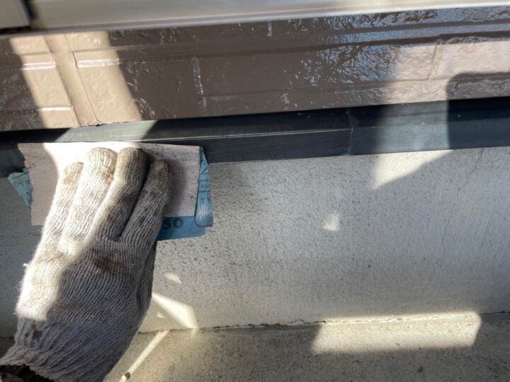 外壁と外壁の間にあるゴムのようなパテの部分の補修作業です。