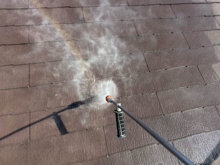 屋根についたホコリや汚れ、コケ等を高圧の水で洗い流していきます。洗浄作業を丹念に行うことで、塗料の性能が十分に発揮されます。