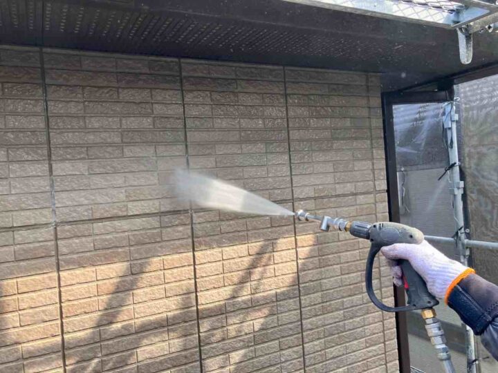 外壁についたホコリや汚れ、コケ等を高圧の水で洗い流していきます。洗浄作業を丹念に行うことで、塗料の性能が十分に発揮されます。