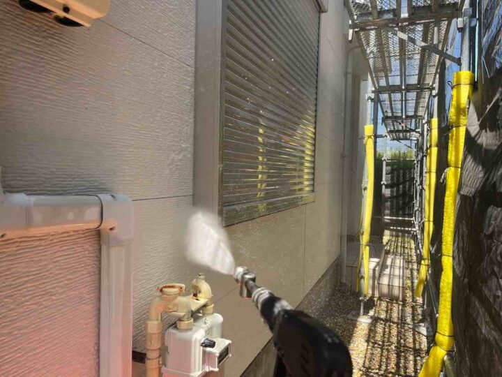外壁についたホコリや汚れ、コケ等を高圧の水で洗い流していきます。洗浄作業を丹念に行うことで、塗料の性能が十分に発揮されます。