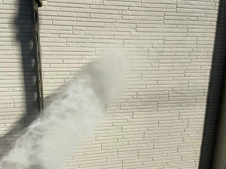 外壁についたホコリや汚れ、コケ等を高圧の水で洗い流していきます。洗浄作業を丹念に行うことで、塗料の性能が十分に発揮されます。