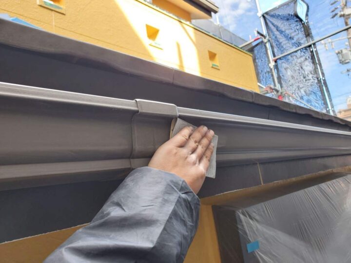 塩ビ(雨樋)や鉄部(雨戸・シャッターボックス・水切り等)は塗装前にケレンを行います。サビ落としや塗料の密着をよくする目的があります。