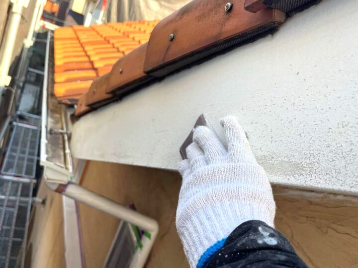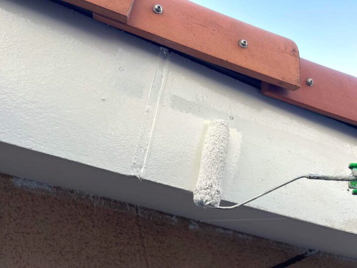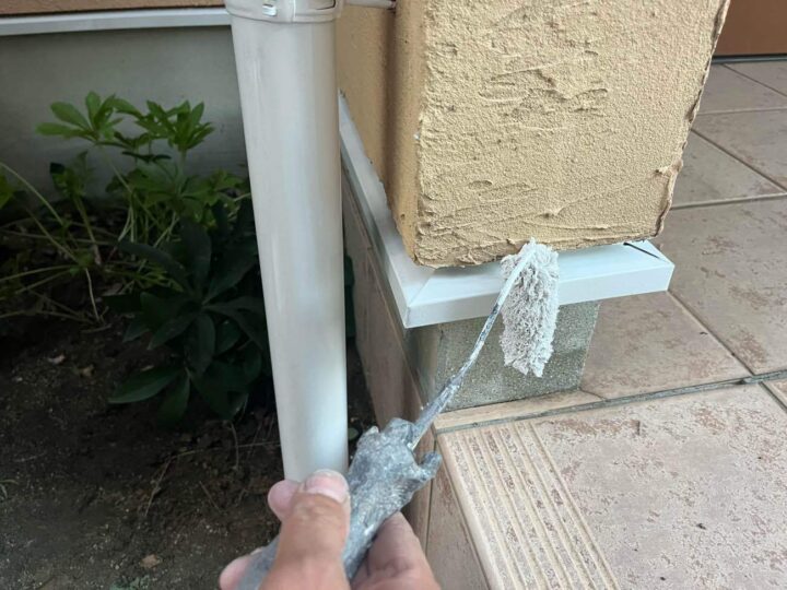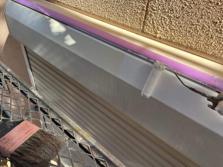 塩ビ(雨樋)や鉄部(雨戸・シャッターボックス・水切り等)は塗装前にケレンを行います。サビ落としや塗料の密着をよくする目的があります。