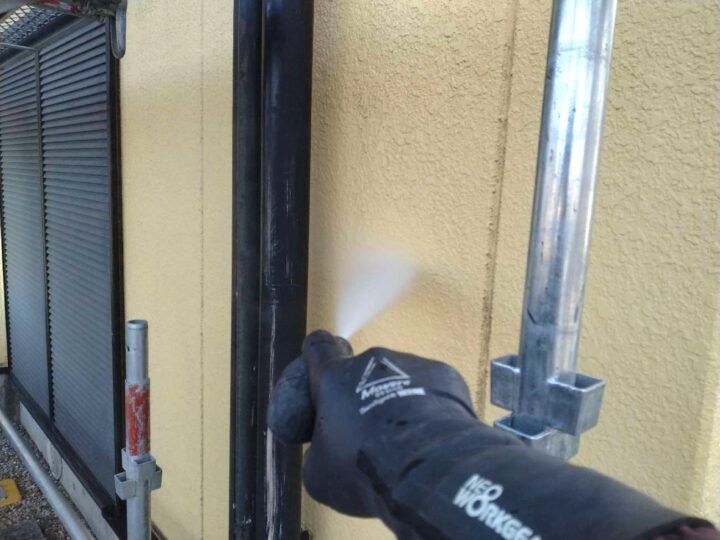 外壁についたホコリや汚れ、コケ等を高圧の水で洗い流していきます。洗浄作業を丹念に行うことで、塗料の性能が十分に発揮されます。