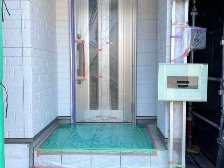 汚してはならないところに塗料が飛散しないよう、細心の注意を払って養生しています。こうした部分のひと手間が、塗装後の仕上がりを大きく変えるポイントです。