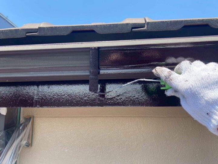 塩ビ(雨樋)や鉄部(雨戸・シャッターボックス・水切り等)は塗装前にケレンを行います。サビ落としや塗料の密着をよくする目的があります。