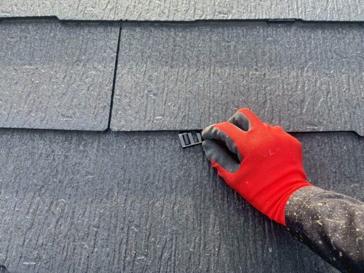 縁切り作業は、屋根材の重なっている部分を塗膜でふさいでしまうのを防ぐ作業です。専用の部材(タスペーサー)を挟み隙間を開けます。