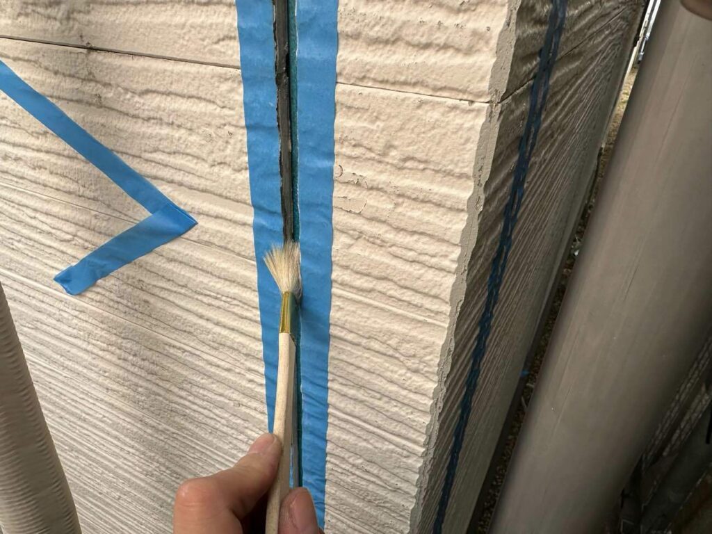 目地や隙間に均一に古いシーリング材を全て取り除き、新しい材料を充填していきます。次に密着性を高めるためのプライマーを塗布。古い薄膜を徹底的に除去し、均一に充填した後、ヘラで丁寧にならします。