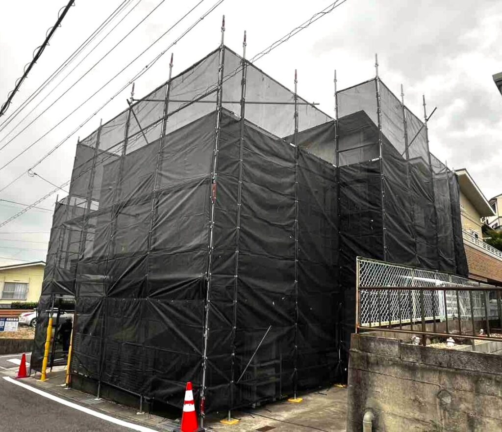 安全かつ高品質な外壁塗装を実現するための第一歩が足場設置です。当社では「クサビ式足場」を採用し、揺れを最小限に抑えた安定した作業環境を構築します。これは職人の安全を守るだけでなく、作業効率を高めることで細部の塗り込み精度を上げるために不可欠です。また、近隣への飛散防止用メッシュシートの張り方一つにもこだわり、風通しを確保しつつ塗料の飛散を完璧に防ぎます。