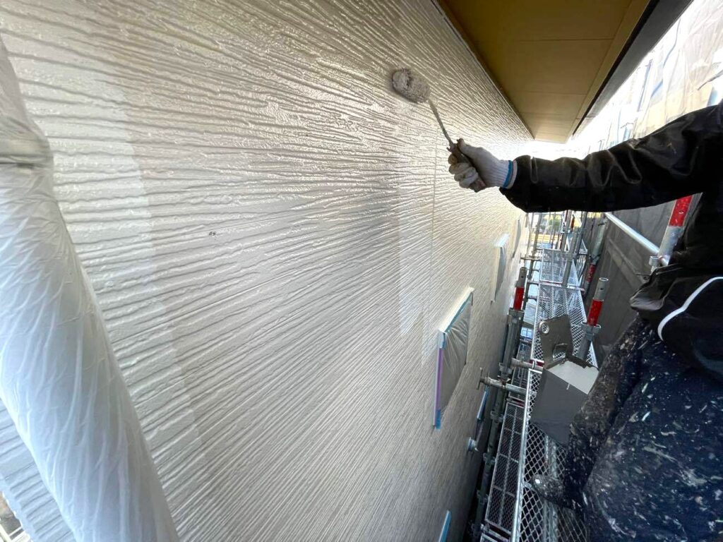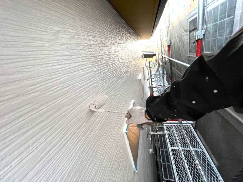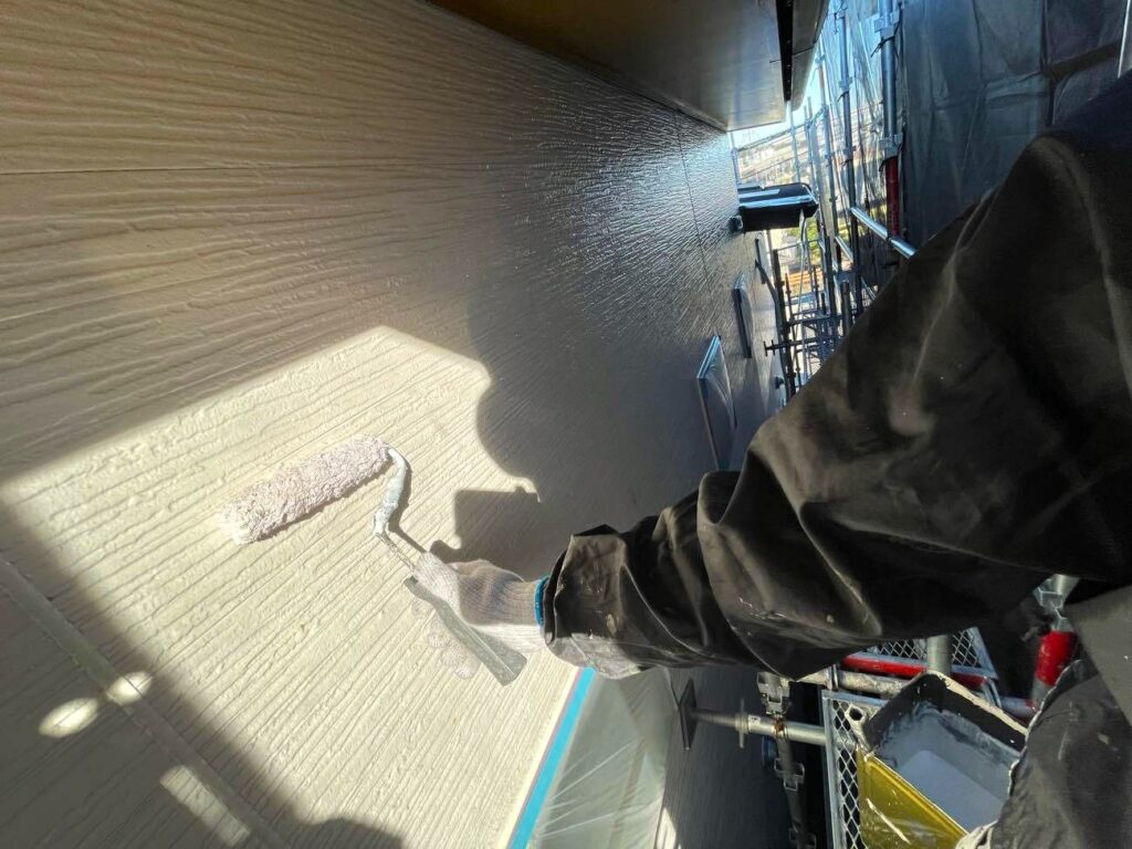 「下塗り・中塗り・上塗り」の3分搗きが基本です。下塗りでは外壁材と塗料を接着させる「プライマー」を塗布し、中塗りと上塗りではお客様に選んでいただいたカラーの塗料を重ねます。中塗りと上塗りで同じ色を塗る場合でも、わずかに濃度を変えたり、膜厚を計測したりすることで、塗り残しをゼロにし、カタログスペック以上の耐候性能を引き出します。