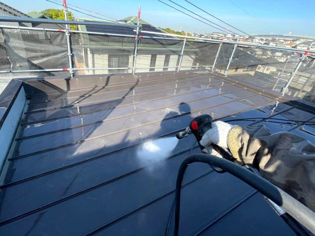 屋根は外壁以上に過酷な環境に晒されます。下塗り段階での吸い込みを確認し、必要に応じて2回下塗りを行うなど、盤石な下地を作ります。また、雨漏り防止に欠かせないのが「タスペーサー」による縁切り作業です。屋根材の重なり目に隙間を作ることで、毛細管現象による雨水の浸入を防ぎ、通気性を確保。住まいの寿命を延ばすための専門知識に基づいた必須工程です。