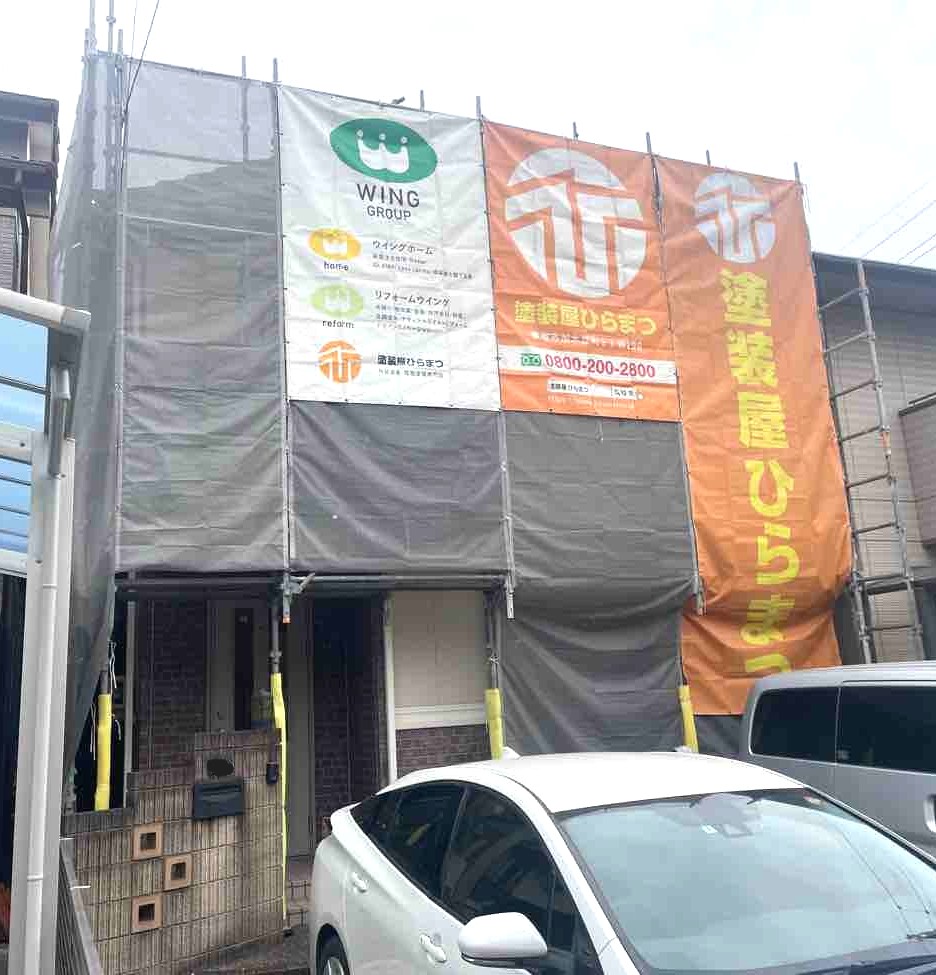 高所での作業を安全かつ確実に行うため、まずは足場を設置します。高圧洗浄や塗装作業の際に生じる水しぶきや塗料の飛散から近隣を守るため、専用のネットで足場全体を丁寧に覆います。この対策によって、周辺環境に配慮した安全な作業環境が整います。