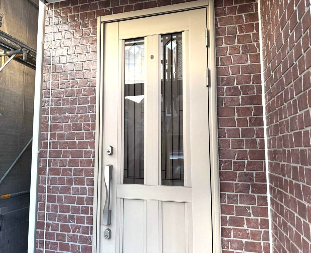 玄関周りのレンガともよくなじむカラーを採用し、やさしく統一感のある仕上がりになっています。