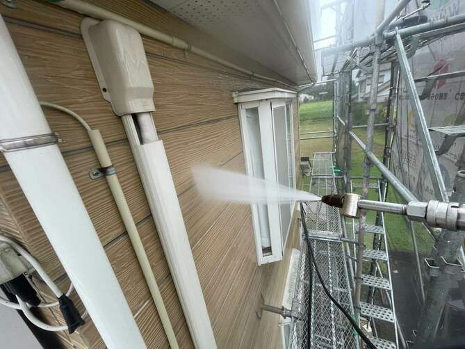 塗装前に高圧洗浄を行い、外壁・屋根に付着したカビやコケなどを丁寧に洗い流しました。高圧洗浄は、仕上がりの美しさと耐久性を左右する非常に重要な工程です。汚れや古い塗膜をしっかり除去することで塗料の密着性を高めていきます。