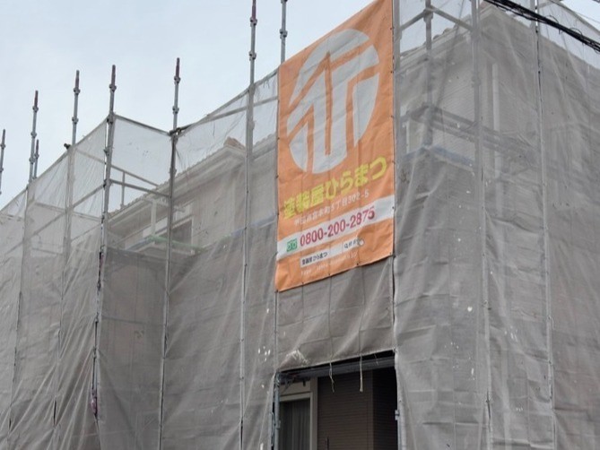 作業の安全性を確保するために、作業の基盤となる足場を組み立てます。そのあと、高圧洗浄時や塗装作業中に発生する水しぶきや塗料の飛散を防ぐために、専用の飛散防止ネットで足場全体をしっかりと覆います。
