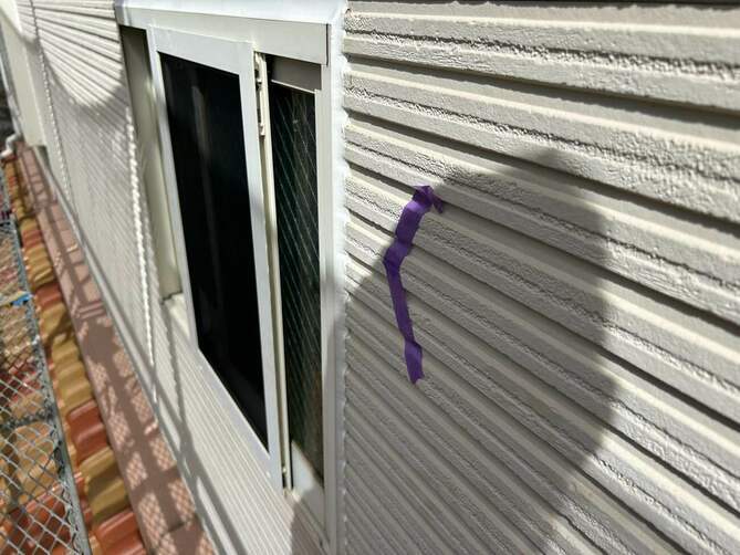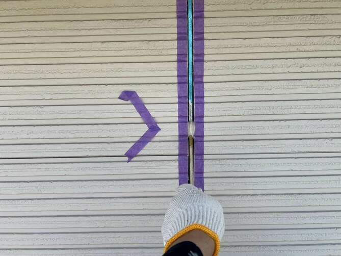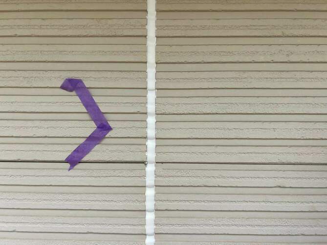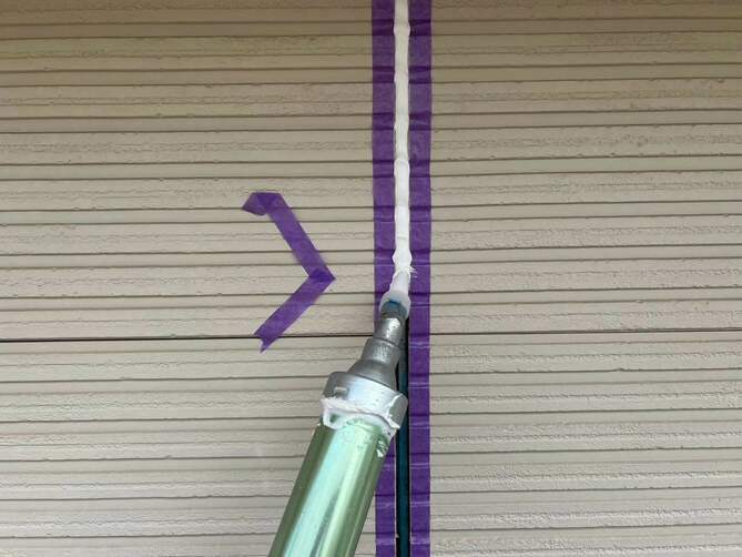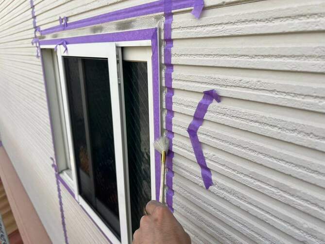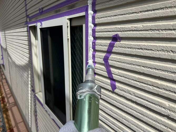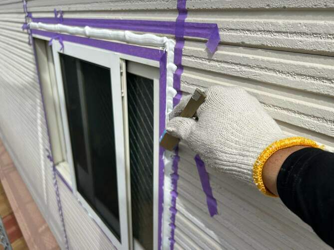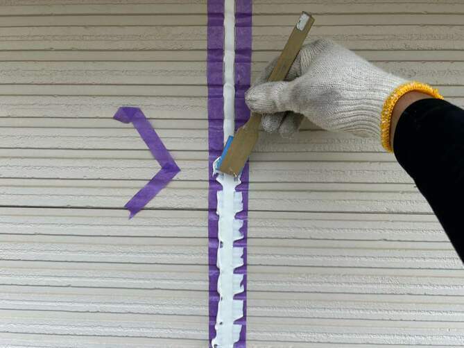 まず外壁の目地に施工されている古いコーキングを丁寧に除去します。劣化したコーキングをそのまま残すと密着不良が起こるため、完全に撤去することが重要です。目地の両側の外壁にテープを貼り、施工部分をきれいに仕上げるための“枠”を作ります。コーキングが外壁としっかり密着するように、専用プライマー(接着剤)を塗布します。専用のコーキング材を置くまでしっかり充填します。充填したコーキングをヘラで押さえ、表面を滑らかに整えます。この作業により密着度が高まり、見た目もきれいに仕上がります。
