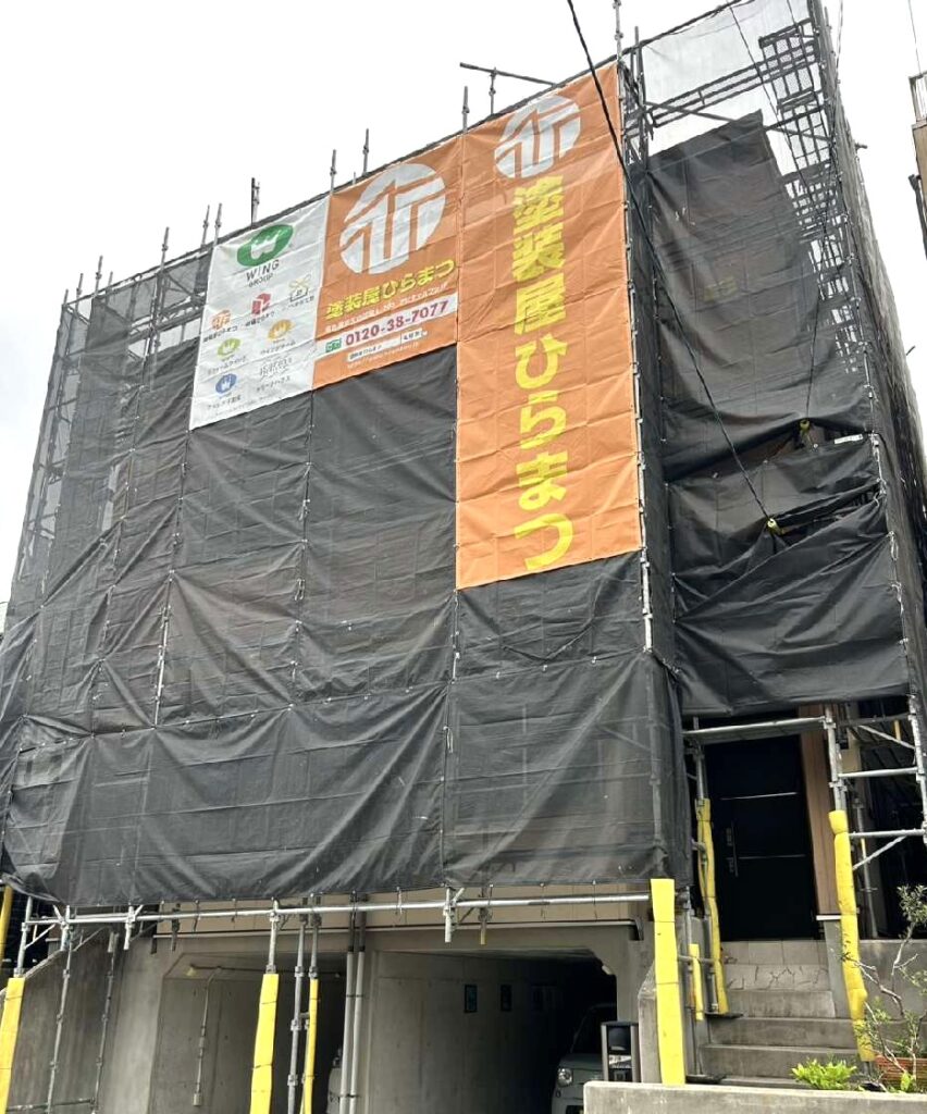 高所での作業を安全かつ確実に行うため、まずは足場を設置します。高圧洗浄や塗装作業の際に生じる水しぶきや塗料の飛散から近隣を守るため、専用のネットで足場全体を丁寧に覆います。この対策によって、周辺環境に配慮した安全な作業環境が整います。
