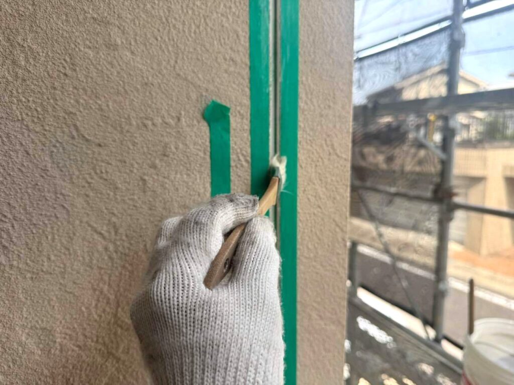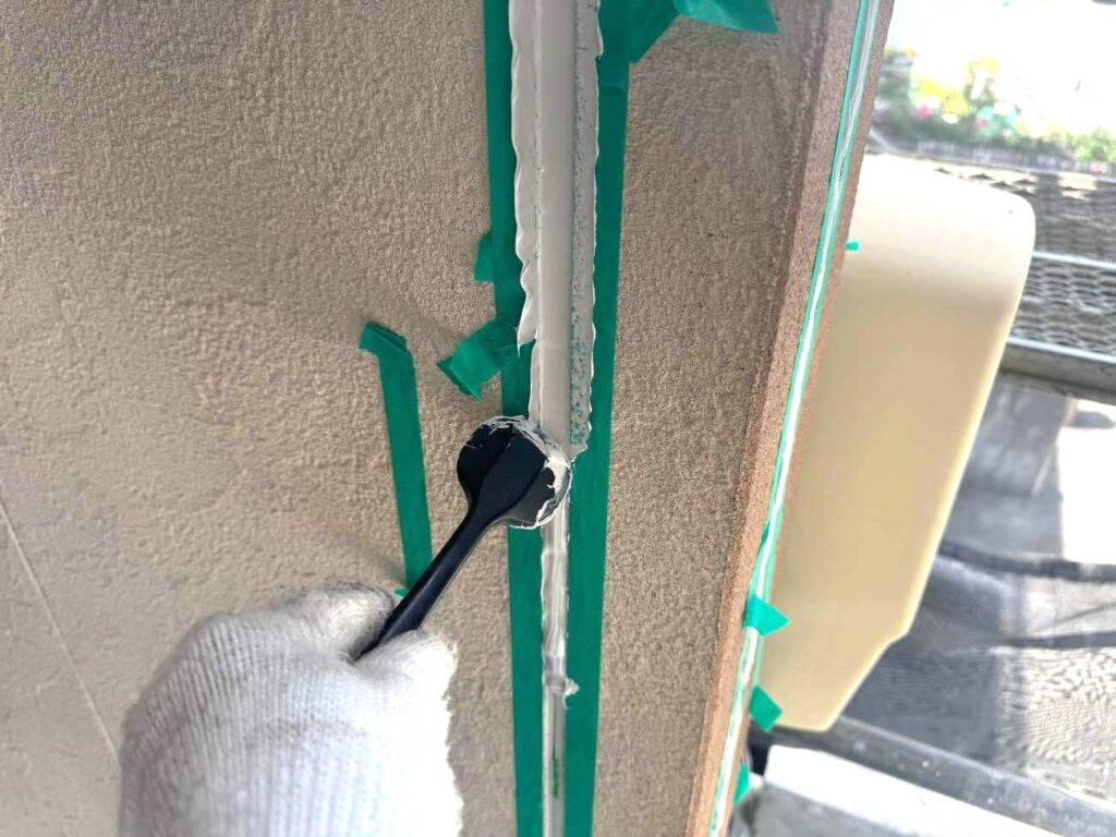 まず、劣化した古いシーリング材を全て除去し、目地以外の箇所をマスキングテープで丁寧に養生します。次に、新しい材料と外壁との密着性を高めるためのプライマーを塗布します。古いカスの徹底除去や、プライマーの均一な塗布を確認した後、新しいシーリング材をムラなく充填し、ヘラで均一にならす精密な技術を発揮します。この専属のプロ職人による確かな施工により、高い防水性と長期的な耐久性が確保され、外壁を長期間守るというメリットが得られます。