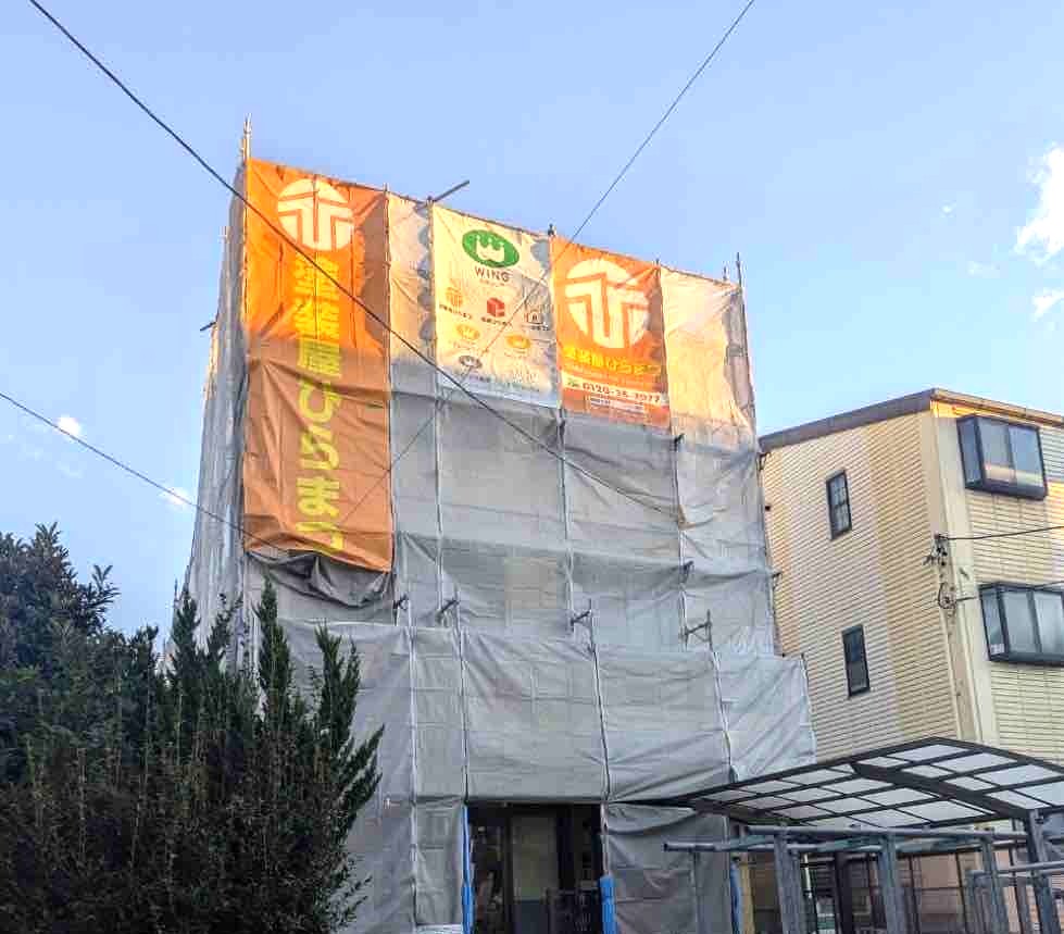 そのあと、高圧洗浄時や塗装作業中に発生する水しぶきや塗料の飛散を防ぐために、専用の飛散防止ネットで足場全体をしっかりと覆います。