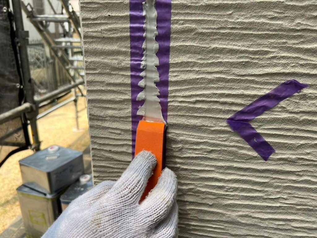 外壁塗装に先立ち、劣化していたコーキングの打ち替え工事を行いました。コーキングは紫外線の影響で硬くなり、ひび割れや隙間が発生することがあります。外壁の目地から雨風の侵入を防す重要な部分のため、すべて撤去して新しく充填することで防水性を高め、建物を長持ちさせます。