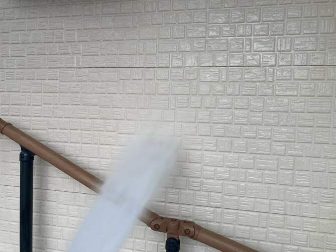 足場設置後には、高圧洗浄を行い、屋根や外壁、付帯部に付着した汚れやカビ、コケ、劣化した旧塗膜を丁寧に洗い流しました。長年蓄積した汚れをしっかり除去することで、塗料の密着性が高まり、剝れにくく耐久性の高い仕上がりにつながります。
