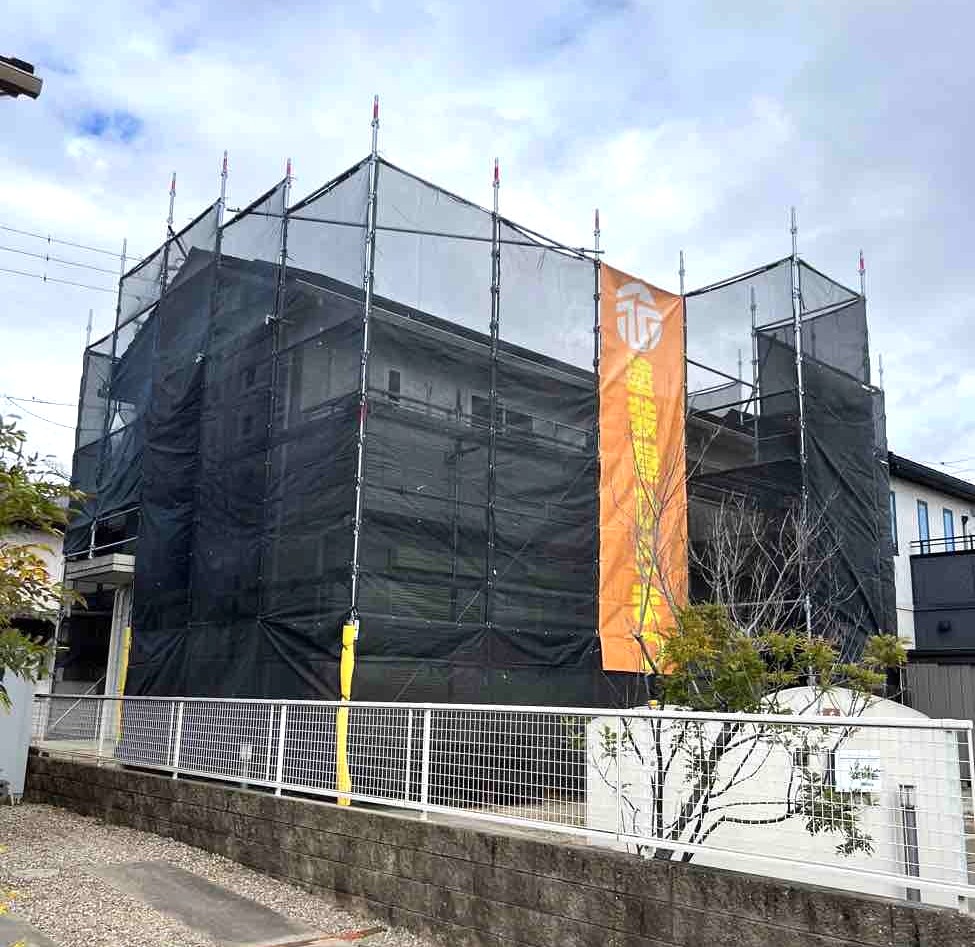 その後、高圧洗浄や塗装時の水しぶき、塗料の飛散を防ぐために専用のネットで足場全体を覆います。