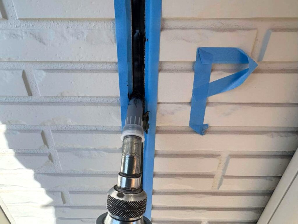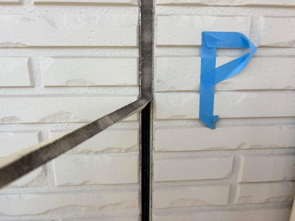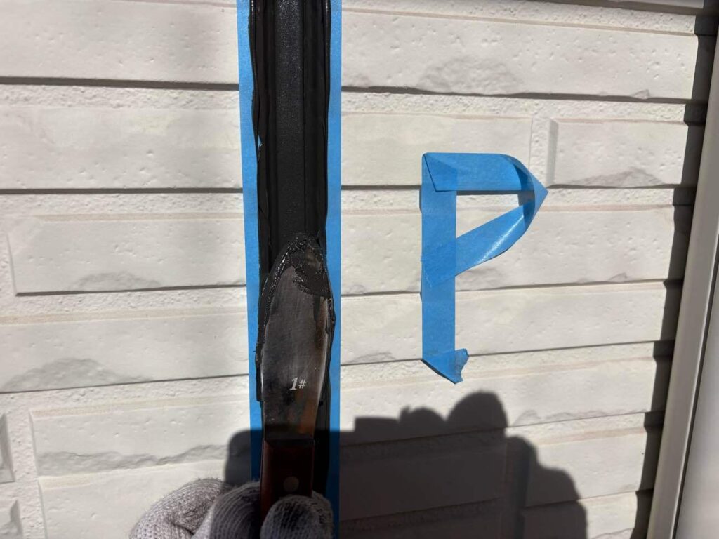 古いシーリング材を全て取り除き、新しい材料を充填していきます。まずマーキングで劣化箇所を示し、マスキングテープで目地以外を丁寧に養生。