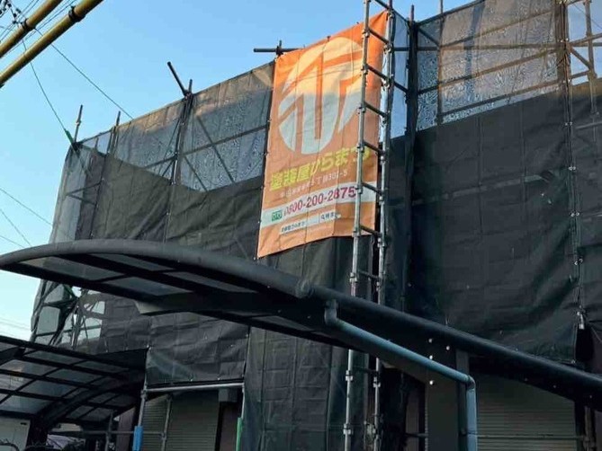 まずは足場の設置から行います。足場は安全確保だけでなく、塗装をムラなく丁寧に行うために欠かせない工程です。また飛散防止シートを設置することで、塗料や洗浄水が周囲に飛び散らないように配慮しています。