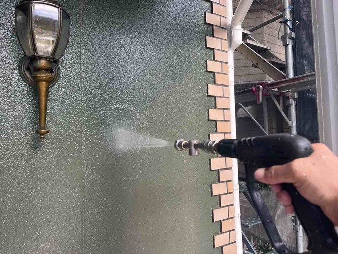 まずは足場の設置から行います。足場は安全確保だけでなく、塗装をムラなく丁寧に行うために欠かせない工程です。また飛散防止シートを設置することで、塗料や洗浄水が周囲に飛び散らないように配慮しています。