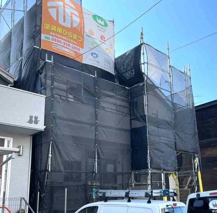 そのあと、高圧洗浄時や塗装作業中に発生する水しぶきや塗料の飛散を防ぐために、専用の飛散防止ネットで足場全体をしっかりと覆います。