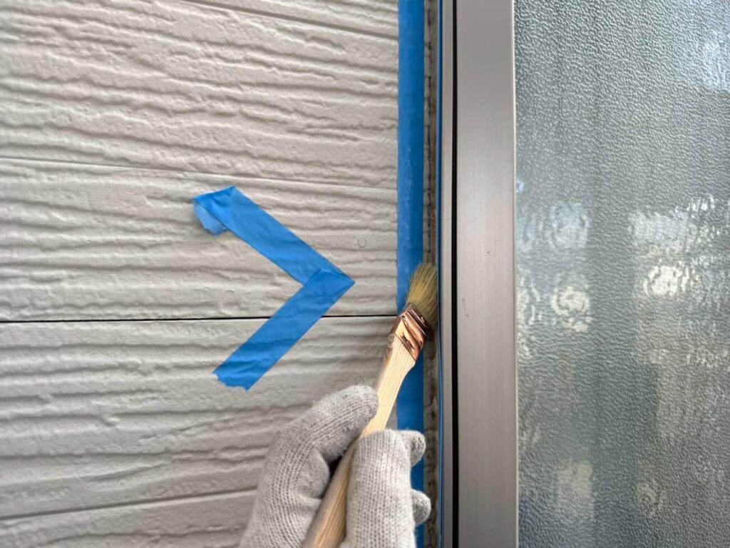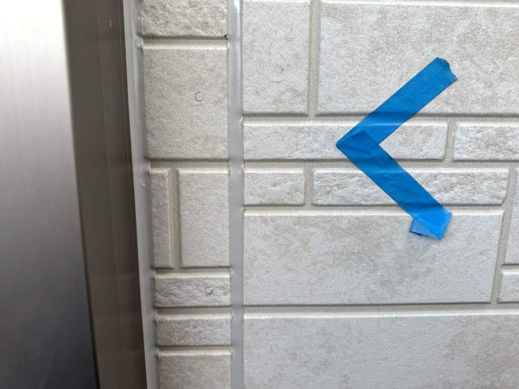 2箇所目のコーキング下地処理を行います。玄関と外壁の間にはどうしても隙間ができます。この隙間にコーキング材を充填することで、雨水などの侵入を防ぎ、建物の内部を保護します。