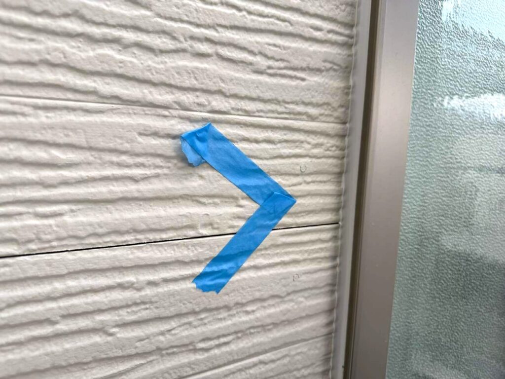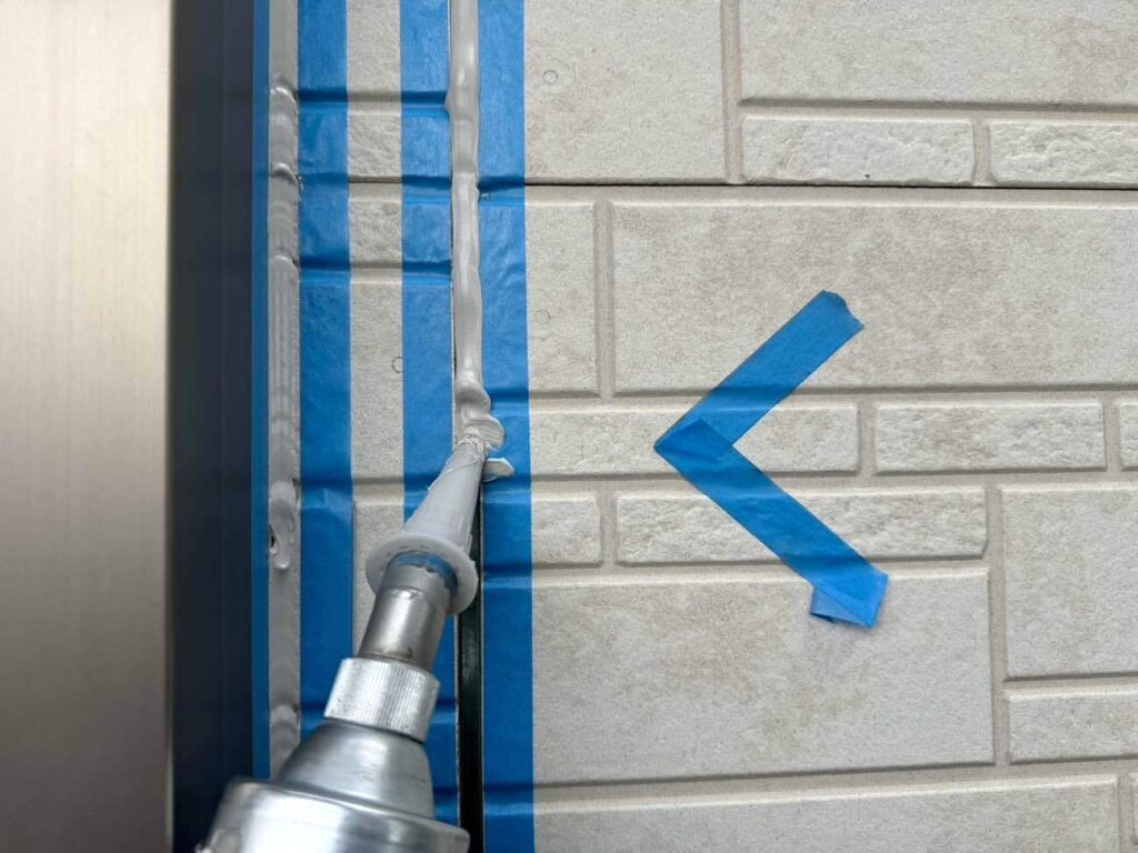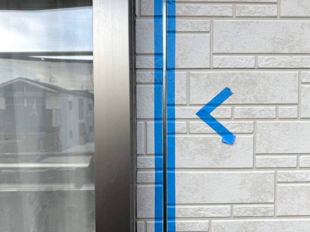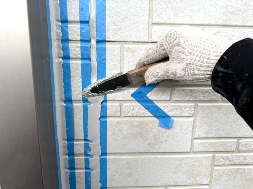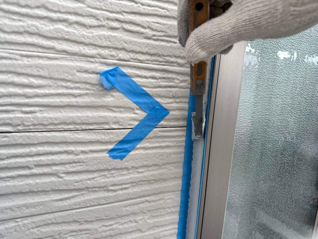 古いシーリング材を全て取り除き、新しい材料を充填していきます。まずマーキングで劣化箇所を示し、マスキングテープで目地以外を丁寧に養生。