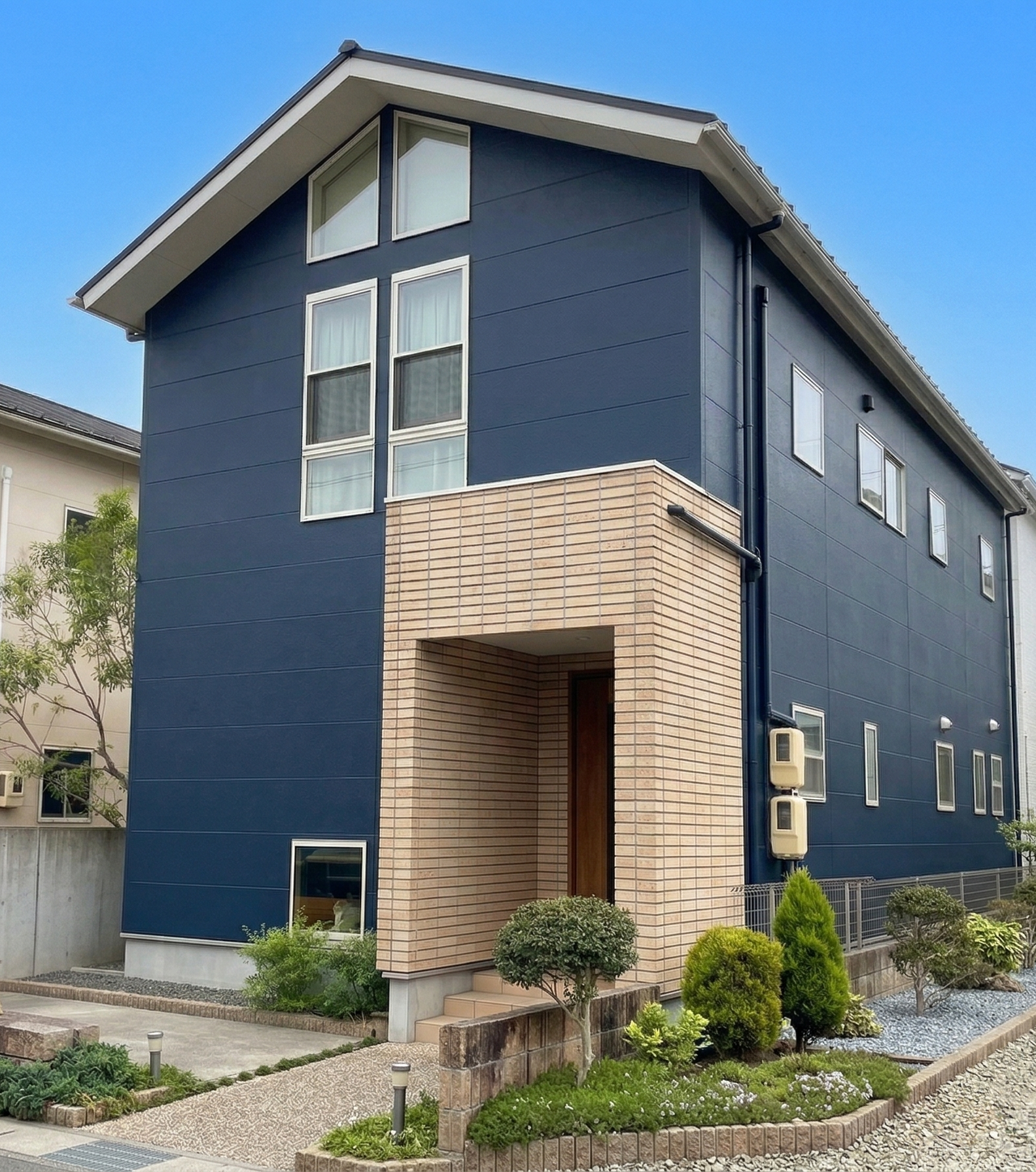 あわせて外構部分も補修・塗装を行い、門まわりや壁面には素材感の仕上がりを取り入れることで、住まい全体に統一感とさりげないアクセントをプラスしました。外壁、屋根、外構をトータルで整えることで、より長く安心して住み続けられる住まいへ生まれ変わっています。